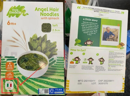 根据包装信息,Little Freddie小皮菠菜细短面是一款原产于意大利的原装进口面条,因此,它应该需要符合欧盟的规定,但结果却出人意料。