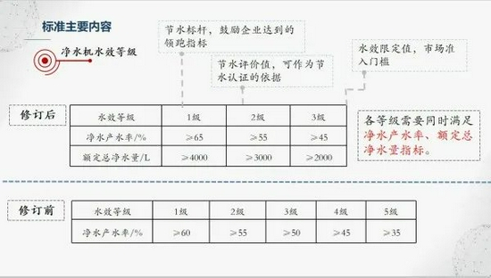 新版水效标准规定了净水机的水效限定值及等级、技术要求和试验方法。主要体现在8个方面,其中水效等级指标的修订十分重要。