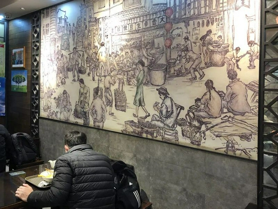 店堂右侧醒目处是占据整面墙的大幅白描壁画,画的是创始时的营业盛景,顾客盈门,喜笑颜开。两侧好几张名人合影,包含着2017年来这里吃馄饨啜生煎的苹果CEO库克。这份努力和当下店里服务员的惜字如金,对比强烈。