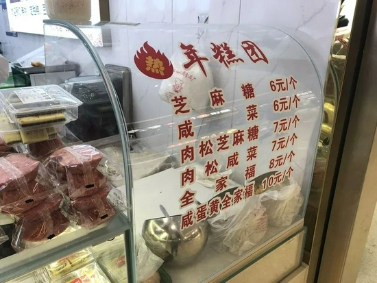 有顾客打算买年糕团,问:“要控制血糖的人,可以吃吗?加咸菜肉松馅子可以吃吗?”“我说能吃你相信吗?我不负责的。”最终,顾客选了咸菜肉松馅的年糕团。