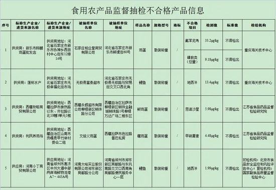 (一)河北省石家庄柏业皇商贸有限公司销售的、来自河北省石家庄市新乐市陈鹏鸡蛋批发店的鸡蛋,其中氟苯尼考、磺胺类(总量)残留量不符合食品安全国家标准规定。检验机构为重庆海关技术中心。
