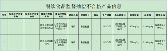 (六)广西壮族自治区百色市田东县黎梅餐饮摊加工自制的油条,其中铝的残留量(干样品,以Al计)不符合食品安全国家标准规定。检验机构为重庆海关技术中心。