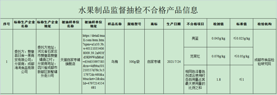 (四)天猫自家枣铺旗舰店(经营者为河北省石家庄市赞皇县日食一果商贸有限公司)在天猫商城(网店)销售的、标称河北省石家庄市赞皇县日食一果商贸有限公司委托四川省成都海湾食品有限公司分装的乌梅,其中亮蓝、苋菜红、相同色泽着色剂混合使用时各自用量占其最大使用量的比例之和等检测值不符合食品安全国家标准规定。检验机构为成都市食品检验研究院。