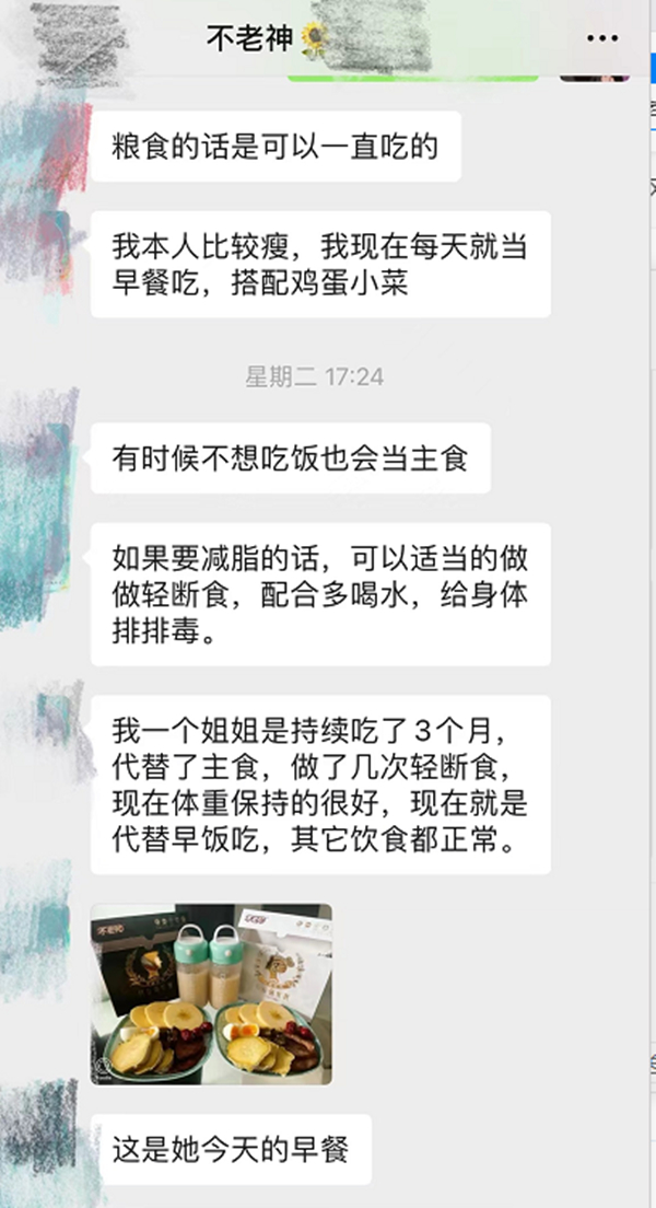 当记者以消费者身份暗访时,不老神市场部工作人员表示,营养强化餐是粮食,不用忌口,配合调整饮食习惯和生活习惯,可以适当代替主食。如果要减脂的话,可以适当的做轻断食,配合多喝水,给身体排排毒。