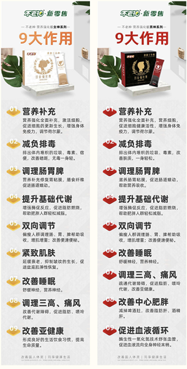 其中,“不老神营养强化餐女神系列”宣称其可以营养补充、减负排毒、调理养胃脾、提升基础代谢、双向调节、紧致肌肤、改善睡眠、调理三高痛风、改善雅健康等9大作用;“不老神营养强化餐男神系列”亦具有营养补充、减负排毒、调理肠胃脾、提升基础代谢、双向调节、改善睡眠、调理三高痛风、改善中心肥胖、促进血液循环等9大作用。