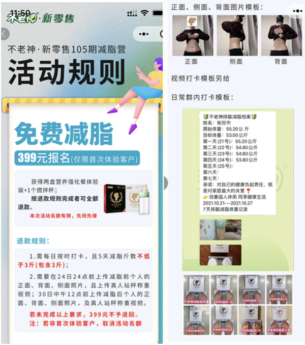 其中,对于退款规则提出两点规定,一是需每日按时打卡,且5天减脂斤数不低于3斤(包含3斤);二是需要在24日24点前上传减脂前个人的正面、背面、侧面照片,且上传真人站秤称重视频,30日中午12点前上传个人减脂后的正面、背面、侧面照片,及真人站秤称重视频。若未完成以上要求,399元不予退回。