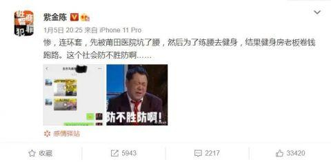近日,紫金陈在个人微博上表示,自己腰部由于之前受伤,目前仍在恢复期,于是买了金吉鸟健身房的会员卡和私教课。