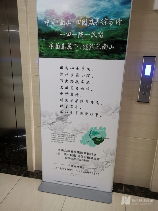 此外,记者在该处的电梯间看到,济南文旅集团参与开发的位于济南南部山区项目(包括民宿)的广告板摆放在电梯出入口。