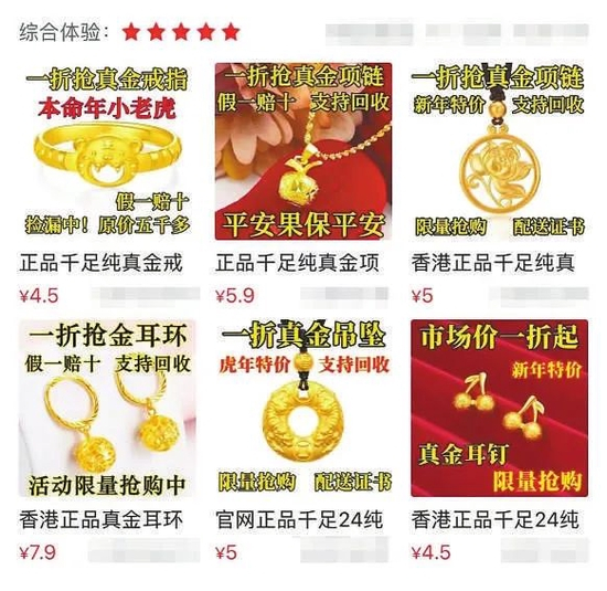 在网上购买小商家的商品,本身就有风险,鉴定证书的塑封以及鉴定都有成本,再加上商品本身的价值,所以网上那些只售卖几元、十几元的“足金”饰品大概率是假的,消费者购买这些明显低于成本价的商品,一定要谨慎。