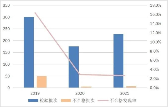 该产品近3年国家监督抽查不合格发现率分别为16.3%、2.8%、2.6%。