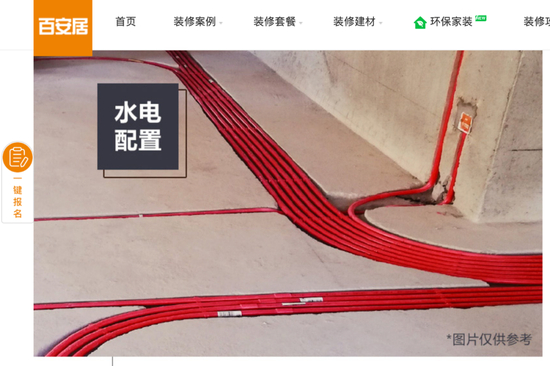 《消费者报道》记者通过百安居官网留意到,百安居官网显示的其中一个套餐包含“水电配置”施工项目,其水电布线整齐美观,线管走的是弯曲布线。章琳家中的实际布线与官网宣传图片的效果则大相径庭。