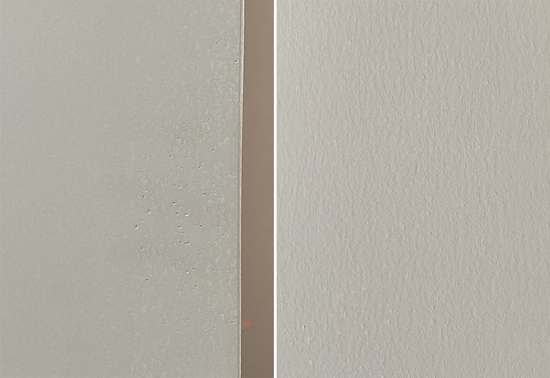 《消费者报道》记者前往章琳家中留意到,墙面波浪起伏,坑坑洼洼,还伴有污渍。仔细观察发现其乳胶漆涂刷不均匀,近看便能看到多处沙眼。此外,安装出来的插座出现歪歪扭扭的情况,且高度设置随意,显得十分不美观。