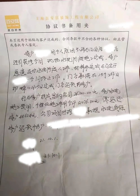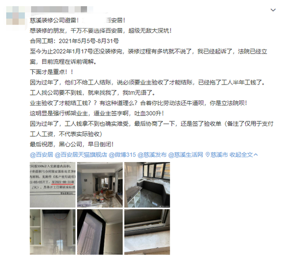值得一提的是,该名消费者在微博描述称,临近过年,百安居不给施工工人发放工资。无奈之下,施工工人只能向业主讨要工资。百安居表示,施工工人的工资要在业主验收后才能结账。考虑到施工工人过年回家需要用钱,该名消费者只能和百安居协商,在仍未完工的情况下签了验收单,认为百安居以这种方式“逼迫”业主“屈服”签字。