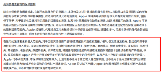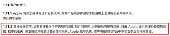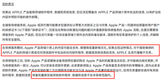 记者登入苹果官网,在“硬件保修服务”“维修服务条款和条件”栏目里注意到一些描述。大致归纳为“对于使用、保修、维修过程中造成的数据丢失,苹果不承担责任”“用户有责任备份苹果产品的数据,以预防可能的操作故障”等。