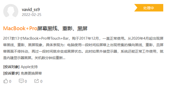 在黑猫投诉平台上,MacBook Pro的故障问题则主要集中在黑线、黑屏和蓝斑上。