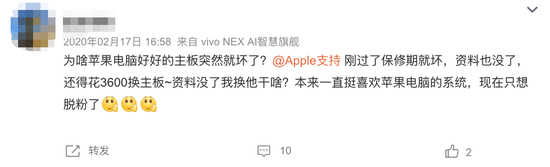 他一再强调,没有损失很重要的资料。但是他觉得苹果在这件事上给出的处理逻辑并不合理。他说:“这次的主板损坏如果是人为的,是我故意磕碰或者摔坏电脑造成的,苹果不给我恢复数据可以理解。但是鉴定结果是非人为损坏,意味着这是苹果产品自己的问题,为什么产品出问题,就能对用户的个人数据置之不理,让用户承担损失?”