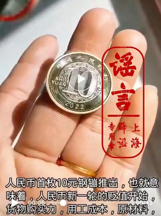 最近,互联网上出现一段说明为“人民币首枚10元钢镚推出”的视频,并称“意味着人民币新一轮的贬值开始”。