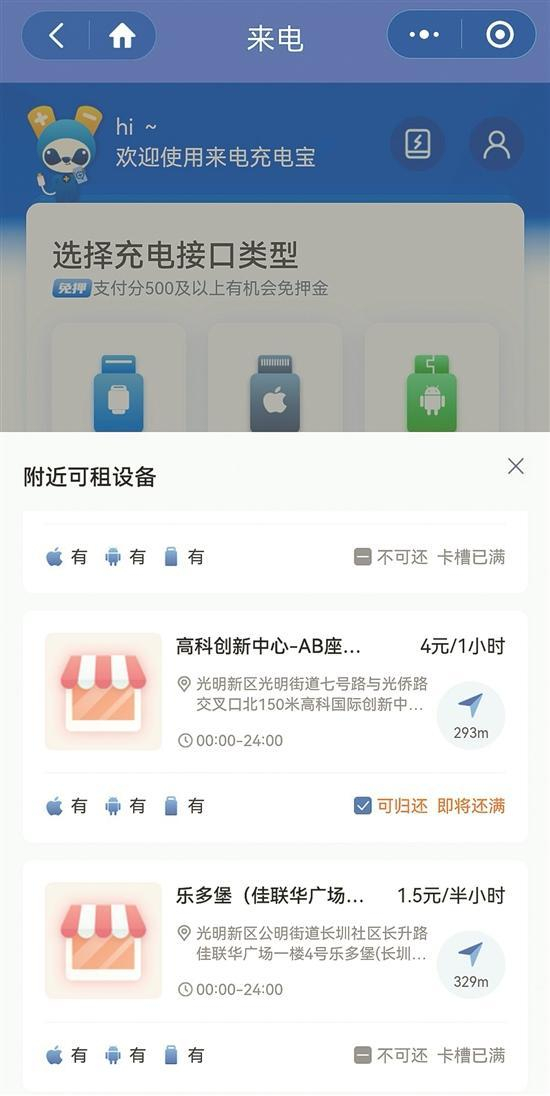 市民易先生家住龙岗区,去年底在福田区与朋友聚餐,手机没电便在餐馆租用了一个充电宝。“晚饭后手机电量还不太够,我就带着充电宝回到龙岗,回到家附近我按照商家提供的归还点去还充电宝,意外的是连续找了三个场所都是满格。就这样,我只得把充电宝带回家第二天才找到归还点,多收了几十块钱。”易先生说。