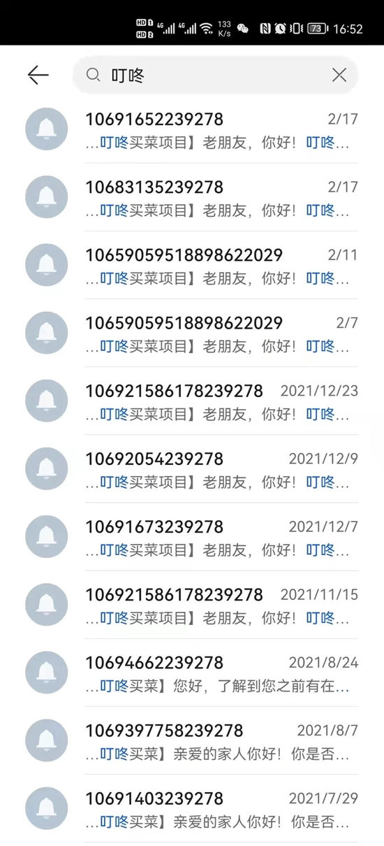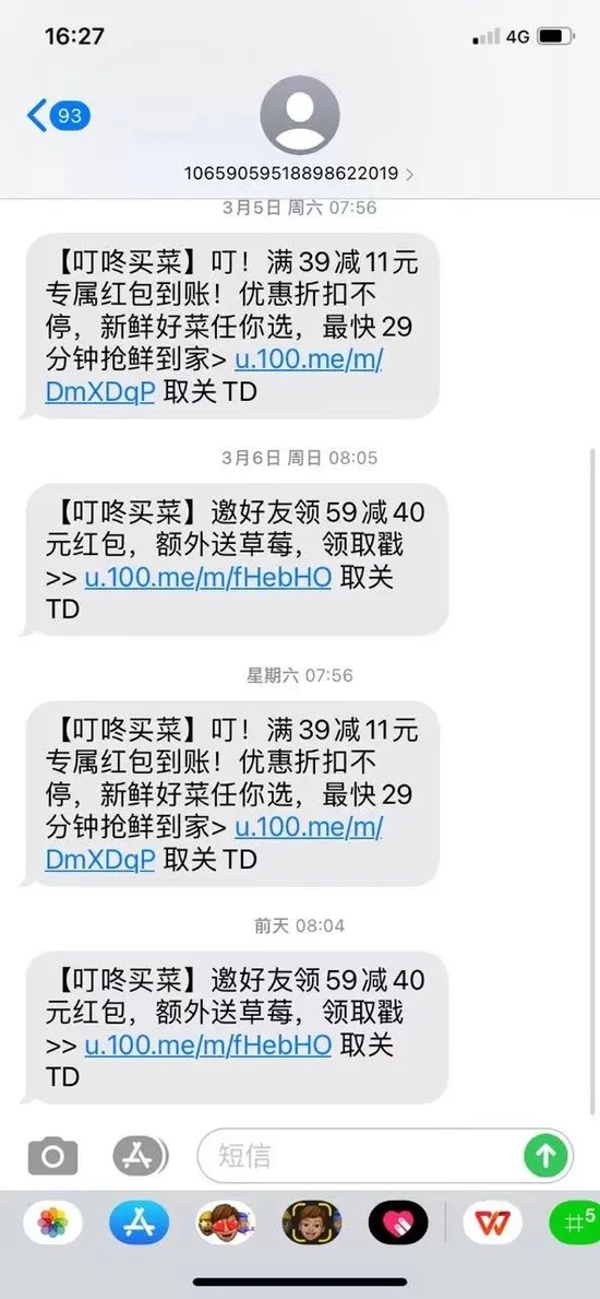 去年3月份,叮咚买菜的地推人员来到森先生所在的公司进行推销。森先生听地推人员介绍上面有优惠活动,便下载了叮咚买菜APP,但印象中只是从上面购买了一两次物品便没有再使用过。森先生说,从此以后他便持续的收到叮咚买菜发送的各种各样的营销短信,什么红包要到期了,商品在搞活动了,每周要发送三到四条短信。因为怕漏掉一些重要信息,森先生听到短信声就去看信息,结果常常发现是叮咚买菜发来的营销短信。