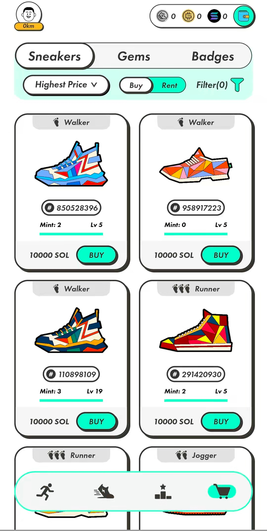 截至4月2日,灰鞋的地板价为7500元左右。STEPN中目前市场上NFT运动鞋的最高定价为10000 SOL币,折合人民币超800万元。而据Bilion观察,Jogger绿鞋在2月初就已经达到2万多元。而且3月时曾有NFT运动鞋以999 SOL币的价格成交,在当时折合人民币超60万元。