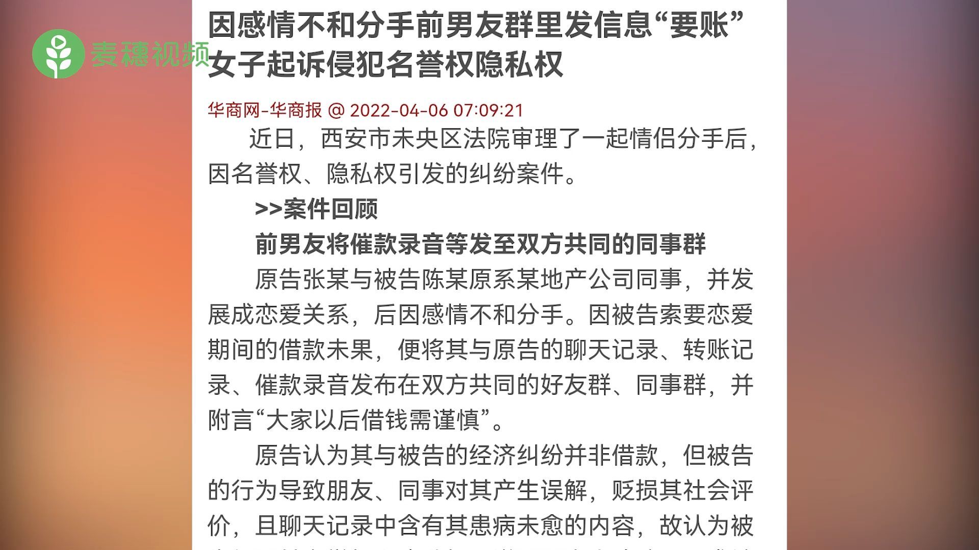 【#男子群里发信息向前女友要账被起诉# 法官:行为不妥】#你觉得群里催债合适吗# 近日,陕西西安,法院审理了一起情侣分手后,因名誉权、隐私权引发的纠纷案件。张某与陈某原为同事,发展成恋爱关系,后因感情不和分手。陈某向张某索要恋爱期间的借款未果,便将催款录音等发至双方共同的同事群。张某认为这些钱并非借款,而且陈某的行为导致朋友、同事对其产生误解,贬损其社会评价,且聊天记录中含有其患病未愈的内容,故认为陈某侵犯其名誉权和隐私权。法官审理认为:前男友行为虽不妥,但尚未达到侵犯隐私权程度。经调解后,张某申请撤诉。(华商网)