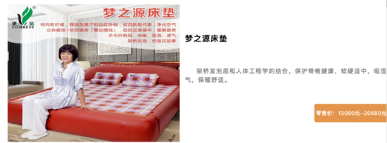 值得注意的是,在其官方网站产品中心,一款“梦之源床垫”宣传具有“特玛粒纤维 促进新陈代谢、净化空气;促进血液循环、缓解疲劳”等;“全能健康床豪华版”床垫宣传具有“减轻压力、消除紧张,帮助快速睡眠”“让健康睡眠改善有据可循”功效等;“康之源健康床垫”详情页中标注“血流不畅的危害:引发头晕目眩、全身无力、高血压、冠心病、脑血栓5大问题”等内容,容易使消费者误认为床垫可以有效促进血液循环,预防和改善疾病等。