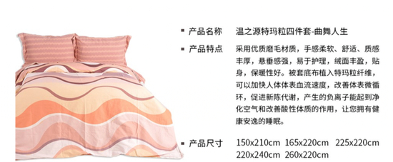 一款“四件套”产品宣传“被套植入特玛粒纤维,可以加快人体体表血流速度,促进新陈代谢,产生的负离子能改善酸性体质的作用”。经调查,该产品均为普通家纺产品,并无医疗效果,也未取得任何医疗管理部门或权威医疗机构的认可。