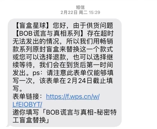 然而22日,他却收到“盲盒星球”发来的短信,被告知由于供货问题,盲盒超时无法发出。为此,平台给出了三个解决方案:一是用畅销款系列原封盲盒来替换;二是选择退款;三是继续等待。