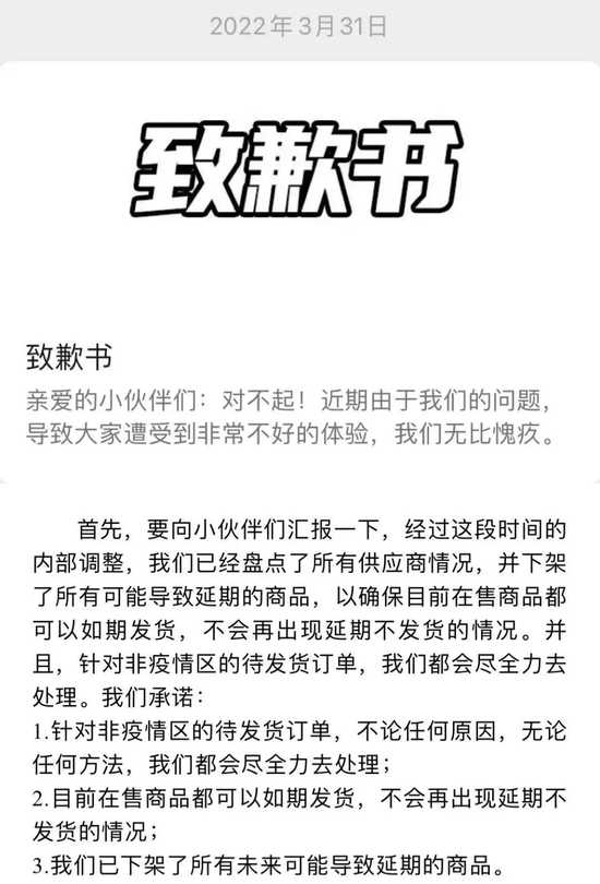 针对大量投诉,3月31日,“盲盒星球”官方微信公众号发布致歉信表示,盲盒星球下架了所有可能导致延期的商品,以确保目前在售商品都可以如期发货,不会再出现延期不发货的情况。