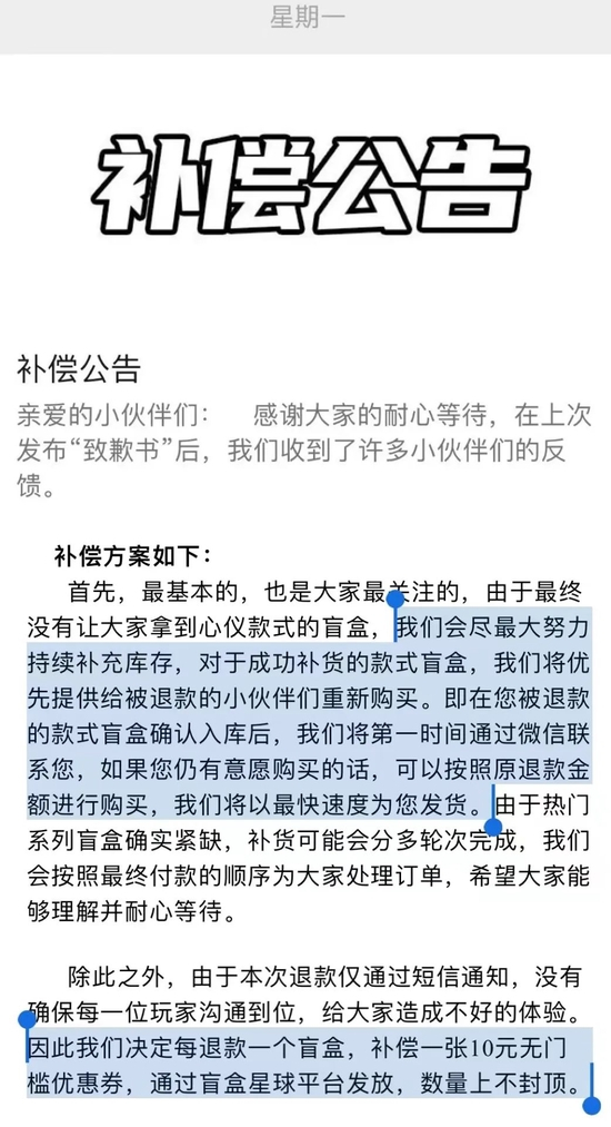 随后,4月11日,“盲盒星球”又发布了一则补偿公告,称待缺货盲盒成功补货后将优先给退款的消费者按原退款金额重新购买的权限。同时,将给予每个退款盲盒补偿一张10元优惠券供消费者使用。