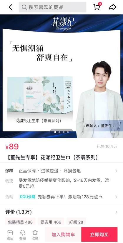 据短视频平台花漾纪网店数据显示,目前,该店仅有两个有效商品链接,同为花漾纪卫生巾套装,其中,标记为“董先生专享”的产品链接已售11.3万件,按照直播间每套89元计算,单品销售额已超千万元。记者试图从其他主流电商平台及线下大型商超搜索该品牌产品进行比对,却难见其踪影;欲就主播推广过程进行核实,却发现董先生珠宝已将带货记录及直播回放予以删除。
