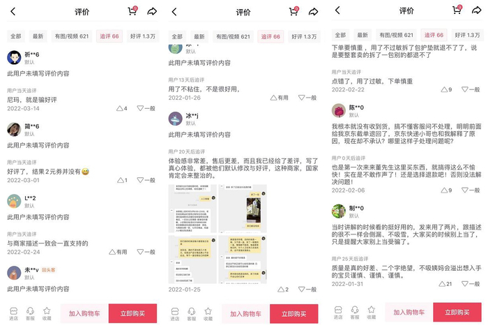 中国网财经记者梳理发现,在产品“追评”(即二次评价,与收货后的首次评价不同,二次评价一般为使用后评价)中,不少消费者对花漾纪产品好评的真实性提出了质疑:“体验感非常差,售后更差,我已经给了差评,写了真心体验,都被他们默认修改为好评,这种商家没人整治么?”“花漾纪就是骗好评”,更有消费者在追评中直言“为了2元返现给了好评,结果商家没兑现”。