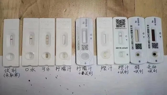 据网传图片显示,标注滴入可乐字样的抗原试剂中,下方T位出现颜色非常淡的黄色横条。而其他,滴入其他液体的试剂均显示正常。另一段网传视频显示,采用橙汁滴入抗原试剂也会出现假阳性情况。