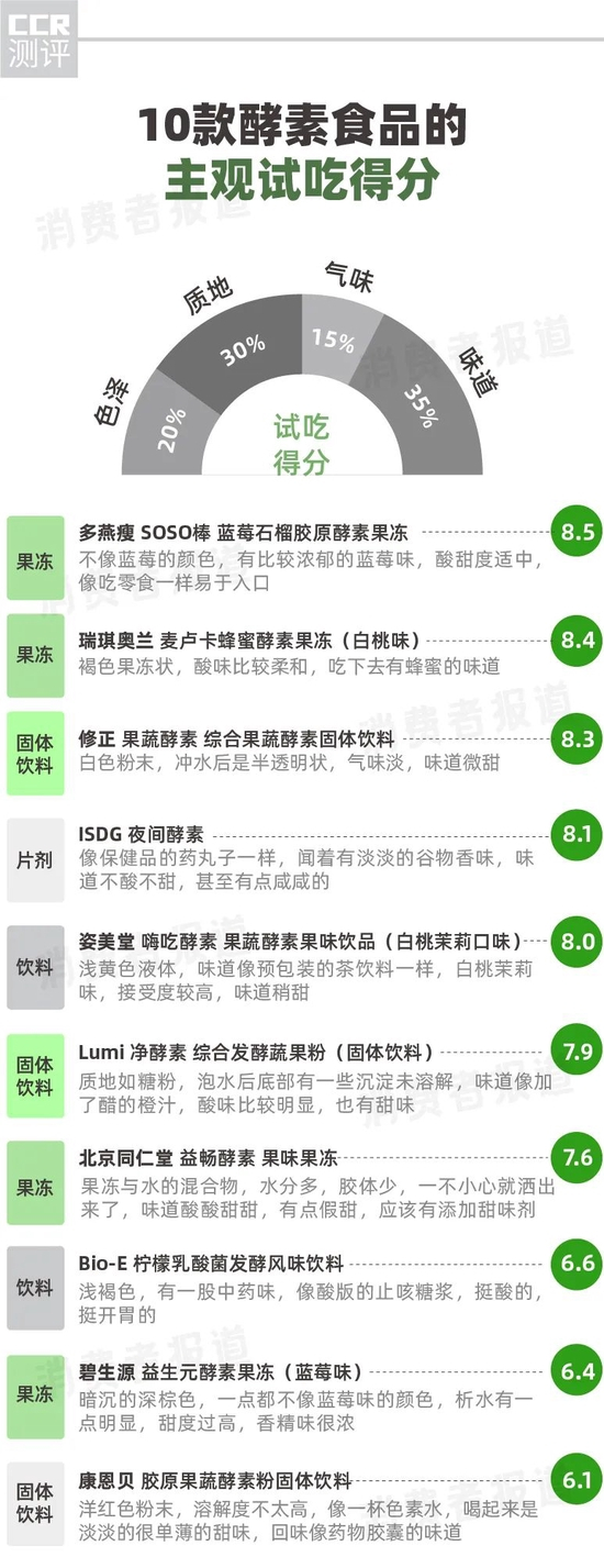 《消费者报道》招募了14名志愿者试吃了10款酵素,对其色泽、质地、气味、味道指标作出评分。