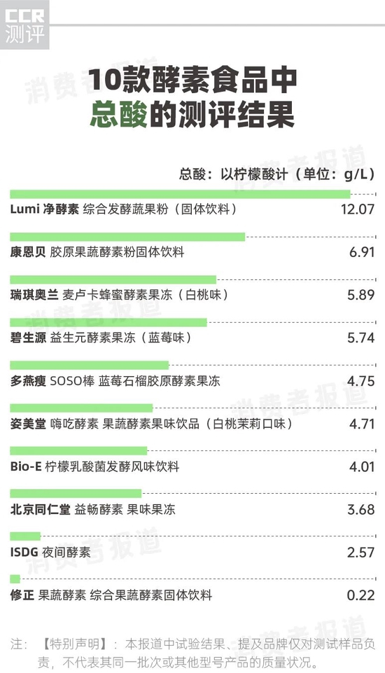 值得一提的是,此次测评的10款酵素有固体饮料、果冻、饮料等多种产品形态。不过,从品质指标总酸的含量上看,不同产品类型的酵素整体上并没有优劣之分。