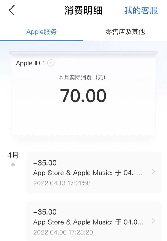 今年4月,陈先生的退休金银行卡发来短信,提醒他当月有两笔35元的扣款,咨询银行才得知,是苹果应用商店扣的款。
