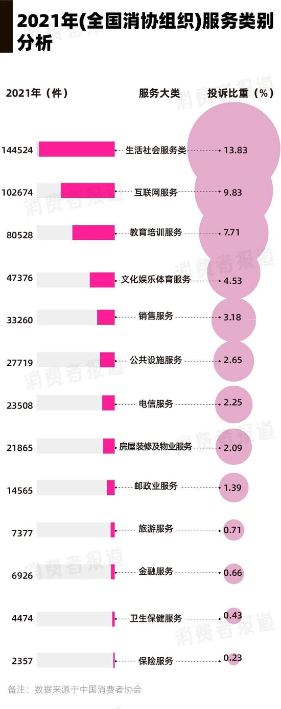 就行业而言,《消费者报道》统计了20个行业,包括家用电器、房产装修、共享出行、电商平台、教育培训、金融/保险、快递物流、旅游/出行/住宿、汽车维修、日用产品、食品类、电信服务、娱乐生活等。就服务类而言,生活社会服务类、互联网服务、教育培训服务、文化娱乐体育服务和销售服务位居服务类投诉量前五位。