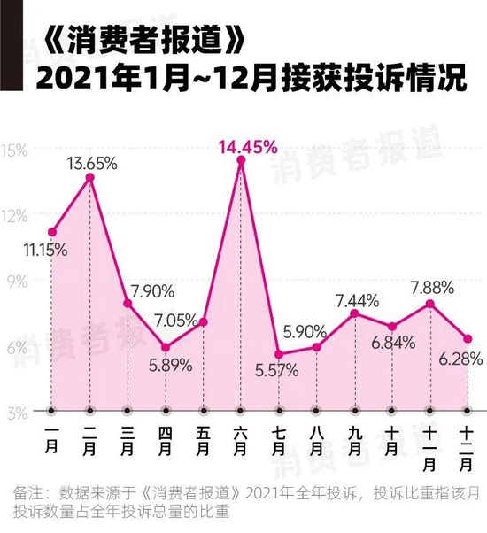 2021年,全国消协组织及《消费者报道》共接获消费者投诉达1094980件,相比2020年投诉量增长3.97%。从时间来看,6月份的投诉量达到全年最高。其中,电商平台的投诉量最多,直播带货成投诉重灾区。
