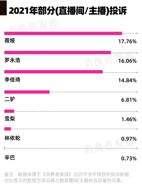 《消费者报道》整理2021年全年投诉数据发现,直播间成电商消费舆情的投诉重灾区。主播李佳琦、薇娅、罗永浩、二驴、雪梨、林依轮的直播间屡遭投诉。在直播间各大主播的投诉中,薇娅直播间位列第一,罗永浩、李佳琦第二和第三。