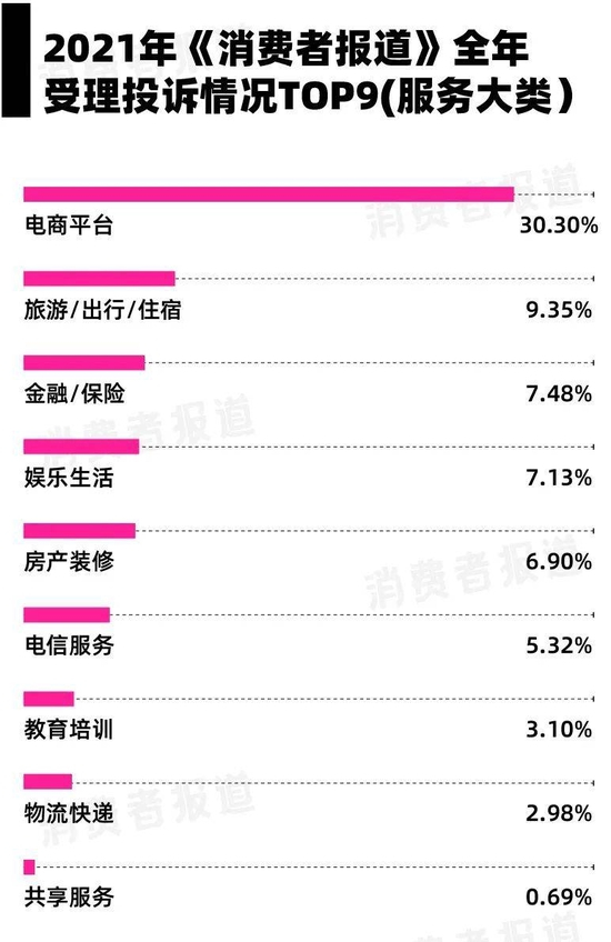 根据本次整理的全年投诉数据发现,电商平台投诉占总投诉量的30.30%,与去年同期相比上升了8.3%。近几年,我国的直播电商行业发展迅速,直播市场规模呈“爆发式”增长。不过,目前直播带货行业尚未成熟,虚假人气、虚假优惠、假冒伪劣商品等侵犯消费者权益的问题频出,直播带货翻车的事件频频登上热搜。