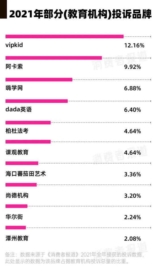全年投诉数据显示,vipkid、阿卡索、嗨学网、dada英语、柏杜法考、课观教育的总投诉量占据前列。