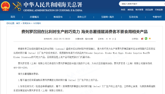 而在国内,中国海关总署也曾于4月15日发布消息称,费列罗召回在比利时生产的巧克力,存在沙门氏菌污染风险,并提醒消费者不要食用相关产品。