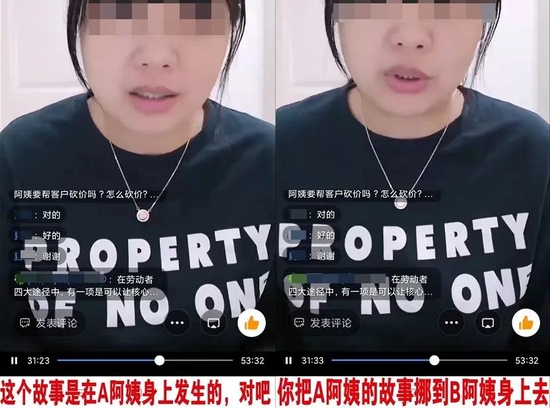 在一则泄露的天鹅到家内部培训直播中,培训老师就曾教过后台服务员工,如何把阿姨 A 的经历,套到 B 阿姨的身上。