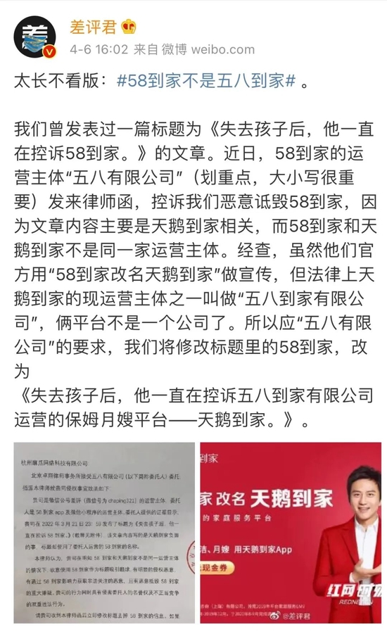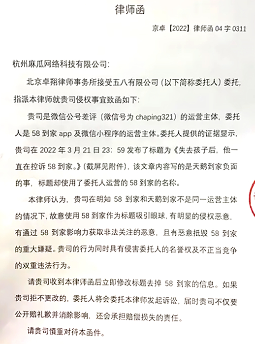 但几天前, 58 到家的运营主体 “ 五八有限公司 ” 发来律师函,控诉我们恶意诋毁 58 到家,因为文章内容主要是天鹅到家相关,而 58 到家和天鹅到家不是同一家运营主体,意思就是说五八 ≠ 58。