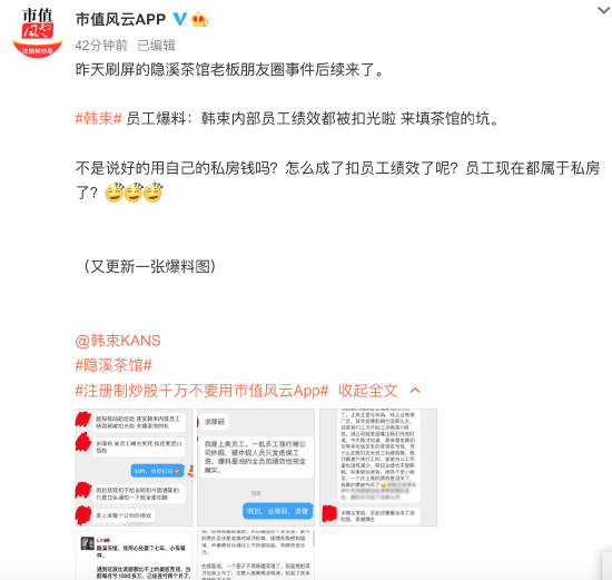 不过,今日,据“市值风云”微博爆料:昨天刷屏的隐溪茶馆老板朋友圈事件后续来了。