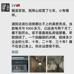 5月4日,一张网传为隐溪老板朋友圈的图片引发关注,该朋友圈称,隐溪茶馆每月亏1000万,已经连亏两个月,“若不是靠我私房钱撑着,早就倒闭了”。