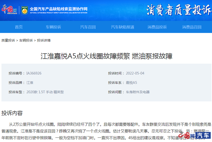 中国网汽车5月7日讯 中国网汽车质量投诉平台近日接到了一位江淮嘉悦A5车主投诉表示,自己的车从2万公里开始点火线圈就出现问题,陆陆续续已经更换了4个,且每次都需要等配件。对此,投诉车主陈先生颇感无奈。
