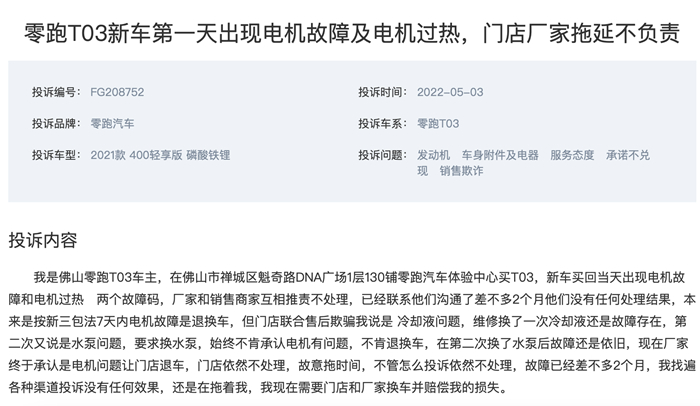 中国网汽车5月7日讯(记者李池)刚过去的4月份,零跑汽车斩获9087辆的单月销售成绩,跃升国内造车新势力第一名,超越了饱受供应链困扰的“蔚小理”。零跑汽车目前在售的三款车型分别为零跑S01、零跑T03和零跑C11,其中零跑T03和零跑C11是其主力走量车型。不过,近日记者在中国网汽车质量投诉平台上接到了一位零跑T03车主的投诉,其反映新车提车当天就出现了电机故障及电机过热故障。