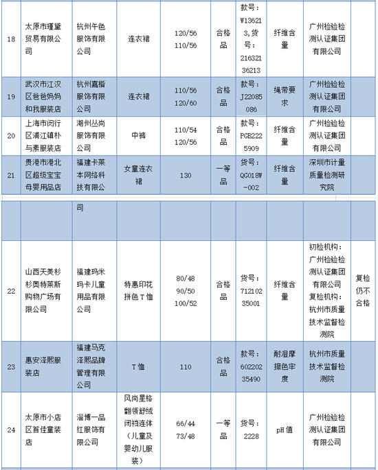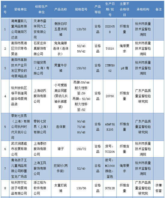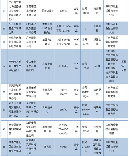 不合格项目涉及pH值、耐唾液色牢度、耐湿摩擦色牢度、纤维含量、附件抗拉强力和绳带要求。