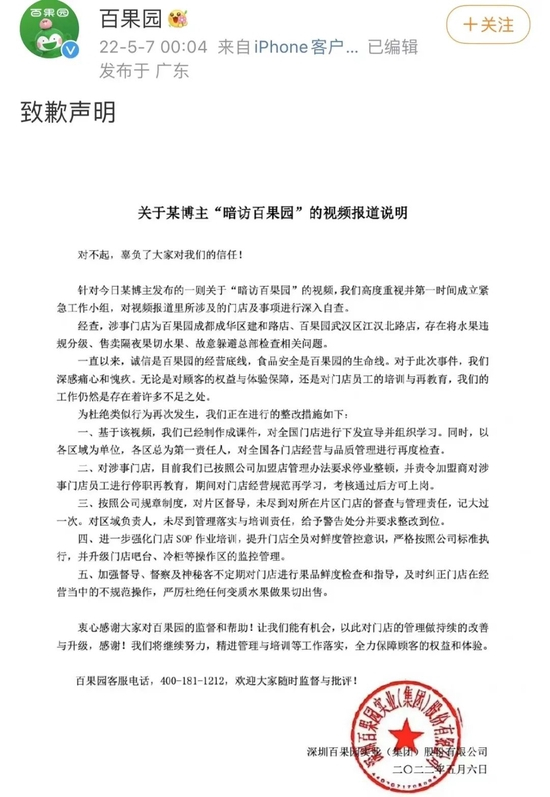 5月7日凌晨,“百果园”在官方微博发布致歉声明称,经自查,涉事门店为“百果园”成都成华区建和路店、“百果园”武汉江汉北路店,存在将水果违规分级、售卖隔夜水果、故意躲避总部检查相关问题。对于涉事门店,“百果园”表示已按公司加盟管理办法停业整顿。
